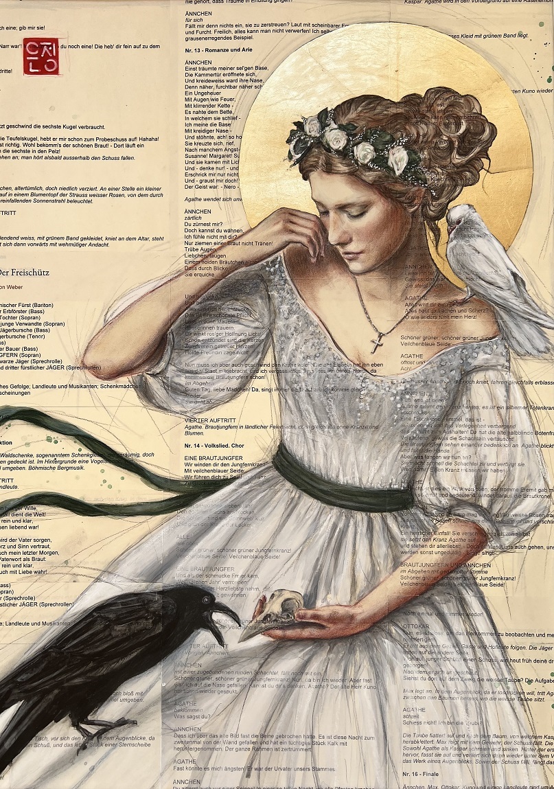 Bona Fide (2023), Watercolor and gold leaf on opera libretto, framed 60x80cm, €1300