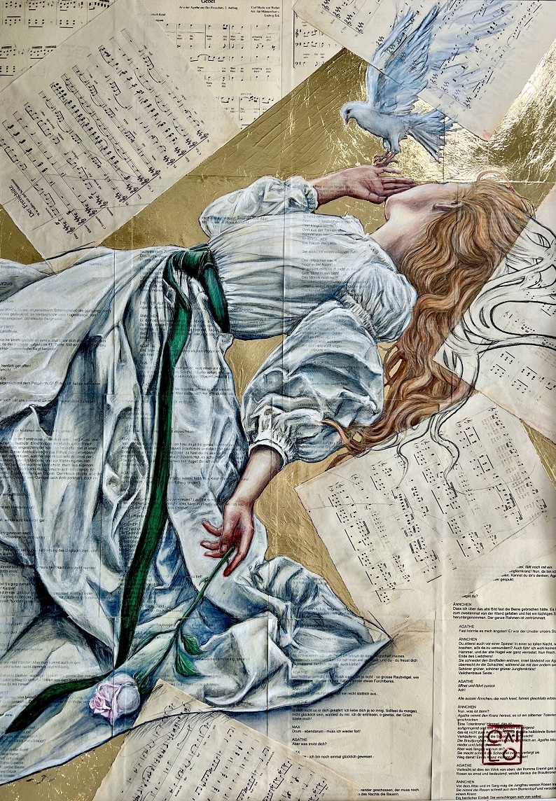 Dreaming of Peace (2024), Watercolor and ink on opera libretto, framed 60x80, €1300